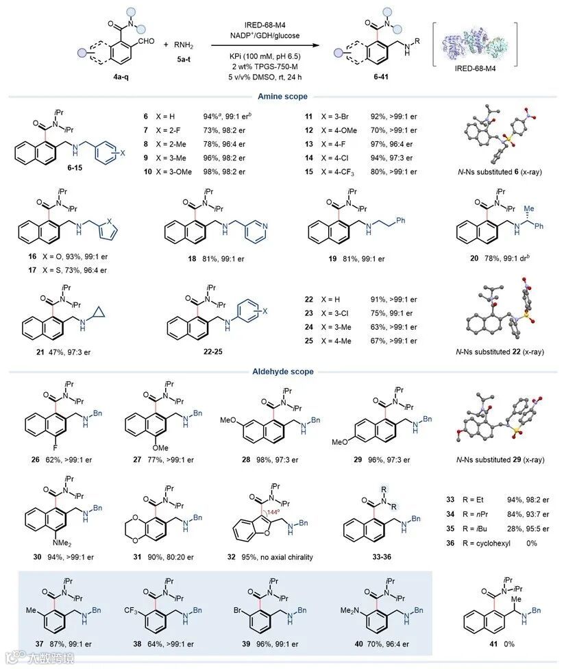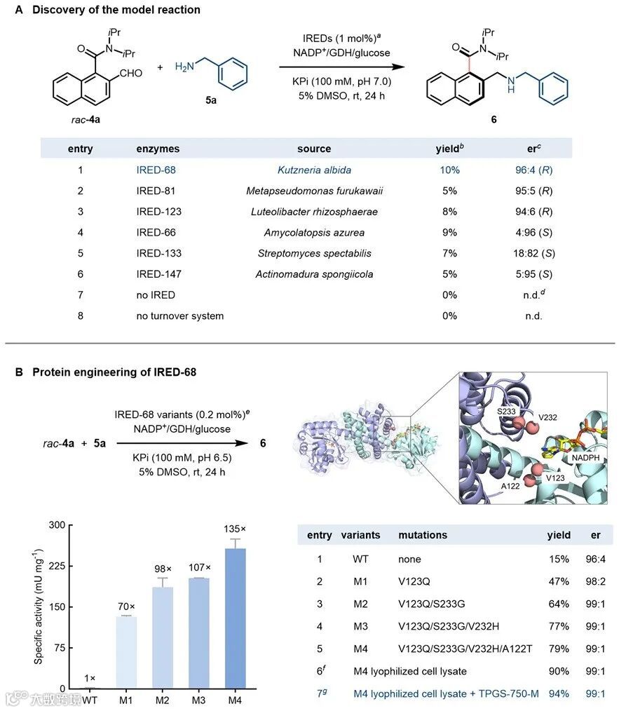 作者首先以消旋萘甲酰胺醛4a与苄胺5a作为模板底物,对一系列野生型亚胺还原酶(IREDs)进行筛选,发现来源于Kutzneria albida 的IRED-68虽在初步筛选中活性较低(产率10%),但对目标产物表现出优异的立体选择性(96:4 er)。为进一步提升催化效率,研究团队解析了IRED-68的蛋白晶体结构,并基于结构信息对其活性中心的13个关键残基进行了迭代饱和突变,最终获得四重突变体 IRED-68-M4(V123Q/S233G/V232H/A122T)。该突变体相较于野生型蛋白,比活性提高了135倍。在后续反应优化中,采用粗酶冻干粉(4 mg/mL)并添加表面活性剂TPGS-750-M(2 wt%),模型反应的产率可提高至94%,对映选择性达到99:1 er。