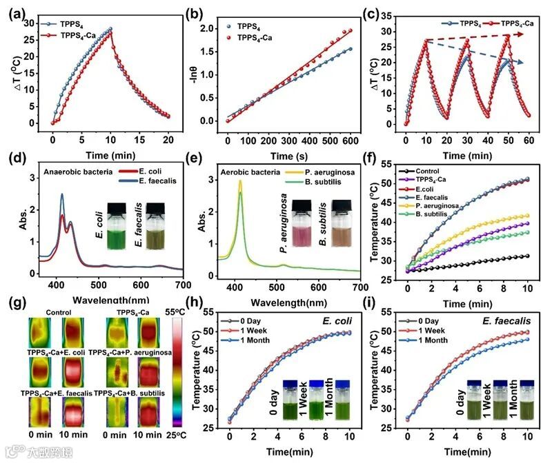 图3. 化学还原TPPS4与TPPS4-Ca的光热性能及细菌触发的原位光热特性。