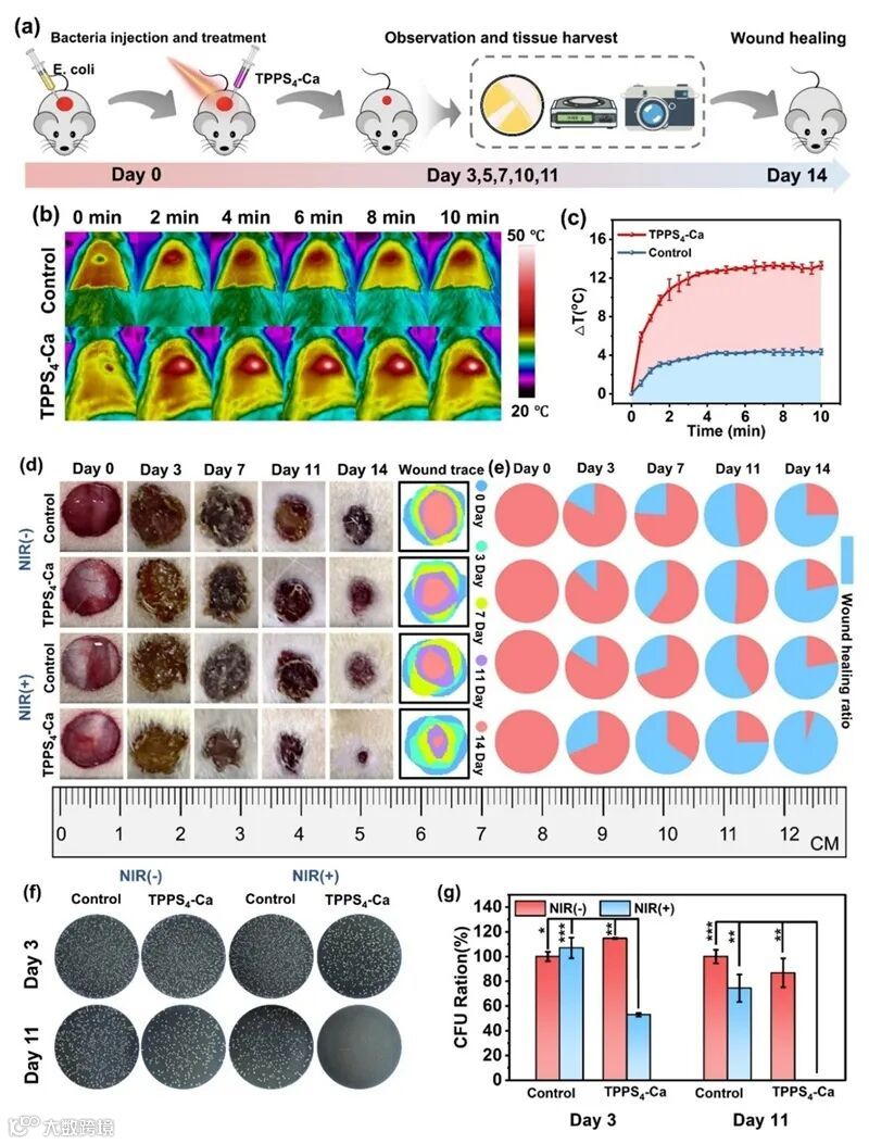 基于此,福建师范大学王雪娇等人提出了一种金属配位介导的阴离子卟啉自组装策略,通过Ca2+与4,4',4'',4'''-(卟啉-5,10,15,20-四基)四苯磺酸盐(TPPS4)的特异性配位构建智能纳米组装体。该设计同时赋予靶向增强和氧化还原响应双重能力。在厌氧病原体(如大肠杆菌、粪肠球菌)的低氧微环境中,TPPS4-Ca可被选择性还原为卟啰啉/二氢卟吩衍生物,其近红外吸收显著增强,光热转换效率达58.17%。值得注意的是,Ca2+在此设计中发挥双重作用:(1)配位组装将TPPS4稳定为长循环纳米结构;(2)作为静电桥梁,增强卟啉组装体与细菌表面的静电相互作用,实现对厌氧病原体的选择性灭活(效率>99.9%)。病原体特异性激活仅在感染部位触发局部光热效应,同时保持良好生物相容性。体内验证表明,该体系在大鼠模型中展现出强效抗菌作用(大肠杆菌存活率降低>99.9%)并加速伤口愈合。本研究解决了广谱光热制剂导致菌群失衡的局限性,为微环境响应性精准治疗提供了新范式。
