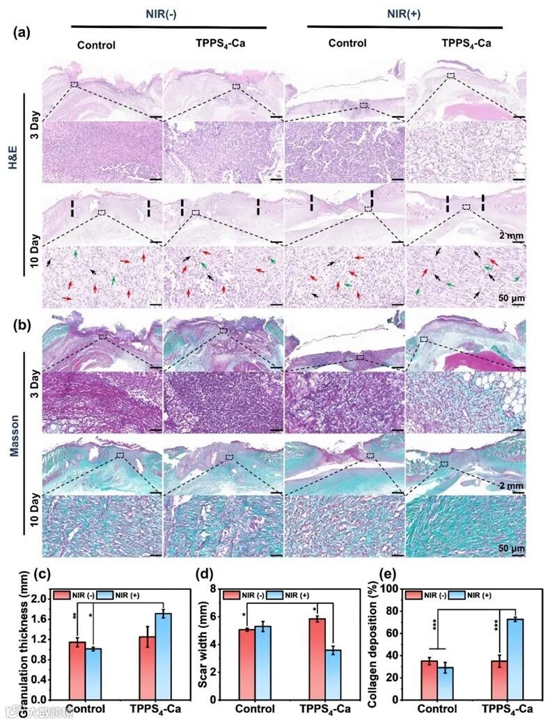 综上,本工作成功构建了一种细菌触发式还原系统TPPS4-Ca,用于实现选择性光热抗菌治疗。在该系统中,Ca2+与TPPS4通过平面外配位形成球形纳米颗粒,该结构可在低氧微环境中被兼性厌氧菌特异性还原,生成具有卓越光热转换效率(58.17%)的二氢卟吩/卟啰啉类衍生物。该配位结构同步实现双重功能增强:一方面通过电荷反转提升静电靶向能力,另一方面通过抑制分子解离与π-聚集猝灭,显著延长系统功能稳定性(在细菌悬浮液中孵育30天后光热效率衰减<1%)。基于上述机制,该系统在实现对病原体高效杀灭(抑制率>99%)的同时,仍能维持哺乳动物细胞的高活性。值得关注的是,TPPS4-Ca的激活强度与混合菌群中具还原活性细菌的丰度呈正相关,表明其能够精准靶向高密度感染区域,并最大程度降低对共生菌主导的微生态环境的影响。在大肠杆菌感染伤口模型中,TPPS4-Ca自组装体系通过精准杀菌与抑制瘢痕形成的协同作用,于第14天实现95.44%的伤口闭合率,展现出显著的临床转化潜力。本研究通过将细菌代谢特异性与光热响应机制相融合,成功突破了传统光热制剂非选择性激活的局限,为开发兼具高效抗菌与组织再生功能的集成型生物材料建立了新范式。