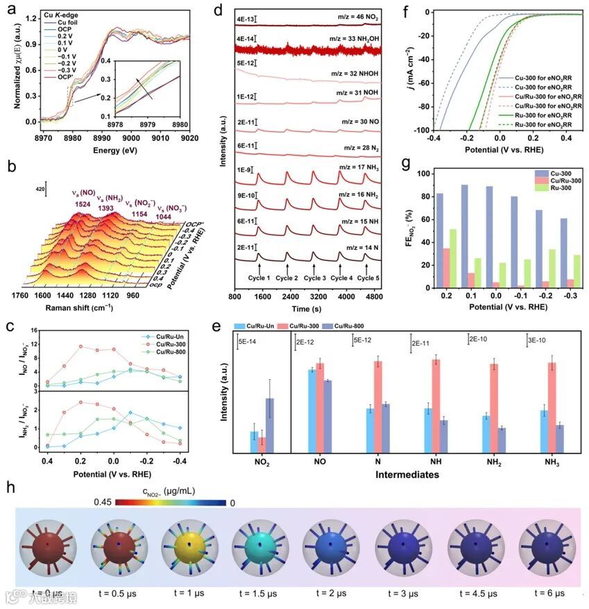 图2通过多维度的原位表征和对比实验,系统验证了Cu/Ru-300在eNO3RR中的真实机理。原位XAS结果(图2a)表明Cu在反应中保持金属态,并在负电位下表现出电子富集,有利于NO3−的吸附与活化;原位Raman光谱(图2b,c)进一步揭示了NO2−、NO、NH2 等关键中间体的生成与消耗规律,且Cu/Ru-300显示出更早出现和更高强度的信号,说明其对中间体转化效率更高;在线DEMS分析(图2d,e)证实反应主要遵循*N路径,同时Cu/Ru-300表现出较低的NO2−积累和更快的下游转化动力学。对比实验表明(图2f,g),Cu 主要促进NO3−向NO2−的初步还原,而Ru则更擅长将NO2−深度转化为NH3,两者在 Cu/Ru 界面实现高效的串联催化;有限元模拟(FEM)(图2h)进一步展示了空心腔体对NO2−的富集和限域作用,为其高效催化性能提供了有力支撑。综合来看,全面印证了“界面效应—级联催化—纳米限域” 的协同反应机制对提升eNO3RR制NH3效率的关键作用。