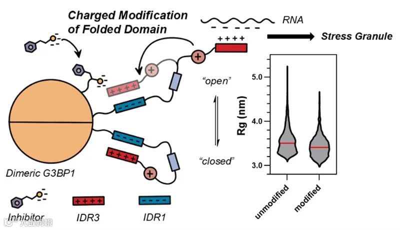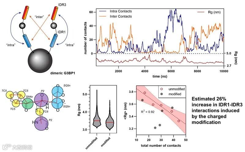 为了进一步理解共价修饰后的结构变化,研究者使用粗粒度分子动力学模拟(coarse-grained MD)对G3BP1二聚体进行建模,发现经过CAA-AA修饰后,蛋白构象呈现出更紧凑的“闭合”状态。具体表现为:惯性半径(Rg)下降,表明IDR构象趋于收缩;收缩程度约可等价于26%的IDR1-IDR3接触数增长,支持电荷引导的构象变化机制。该模拟不仅为实验结果提供了理论支持,也验证了通过改变蛋白表面电荷即可调控其相分离能力的核心假设。