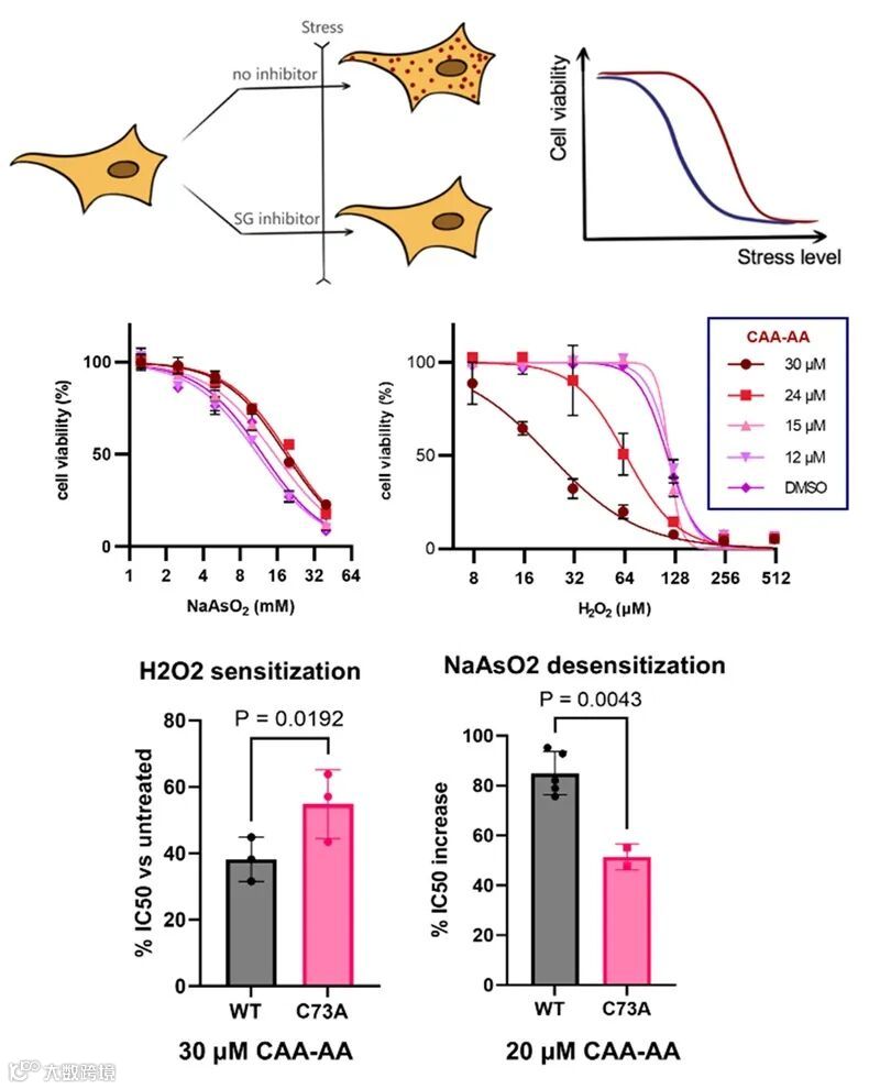 为了系统验证该策略的有效性,研究者开展了一系列功能和机制实验。显微成像结果表明,多个CAA衍生物在HeLa细胞中显著抑制NaAsO2诱导的SG形成,且不同结构对活性影响显著。细胞功能实验结果表明,在氧化应激模型中(H2O2处理),处理后细胞对应激变得更敏感,表明SG功能受损。突变与敲低实验结果表明,C73A突变显著减弱CAA-AA抑制能力,而对不含甲基脂基团的CAA衍生物无效,进一步敲除G3BP2也未改变这一趋势,表明CAA-AA通过修饰G3BP1抑制应激颗粒形成。