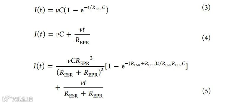 众所周知,理想的EDL电容器在CV测量中应呈现完美的矩形形状。然而,测量过程中不可避免的寄生电阻可能导致其偏离理想形状,这可以用公式 3-5来描述: