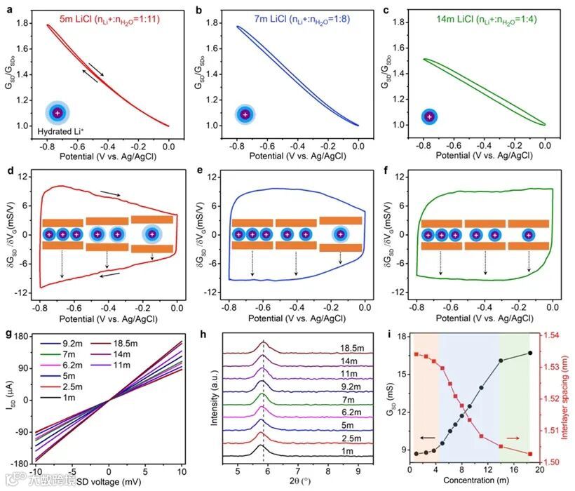 为了进一步测试浓度依赖性的溶剂化结构,研究团队探测了在不同Li+浓度电解质中在开路电压下的I-V曲线。总体而言,I-V曲线的斜率随着Li+浓度的增加而增大,GSD从1 m LiCl中的8.7 mS增大到18.5 m LiCl中的16.7 mS。该结果揭示了MXene的电导与Li+水合程度(或Li+的溶剂化结构)之间存在很强的相关性。为了阐明溶剂化Li+对MXene层间距的影响,研究团队还测量了不同Li+浓度下MXene薄膜的(002)衍射峰。随着Li+浓度的增加,(002)峰向更高的角度移动,从1 m LiCl中的5.75°移动到18.5 m LiCl 中的5.88°,这对应于层间距从15.34 Å 减小到15.02 Å。这一发现进一步证实了ETS信号的变化由MXene纳米片与 Li+之间距离的变化引起。