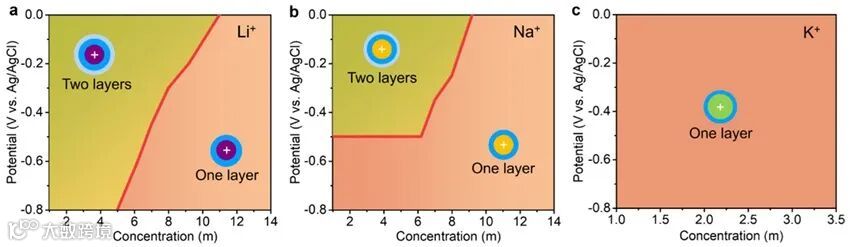 对于K+情况,在测量的电解质浓度和电化学电位范围内,微分 ETS 曲线的值几乎保持不变,表明K+插入MXene层间就不会进一步脱溶剂化。这种行为与高浓度下Li+和Na+的行为相似。这可以归因于K+较低的水合能,该水合能不足以在插层过程中保留第二溶剂化壳层,插层后仅保留第一溶剂化壳层,无论电解质浓度或电化学电位如何。