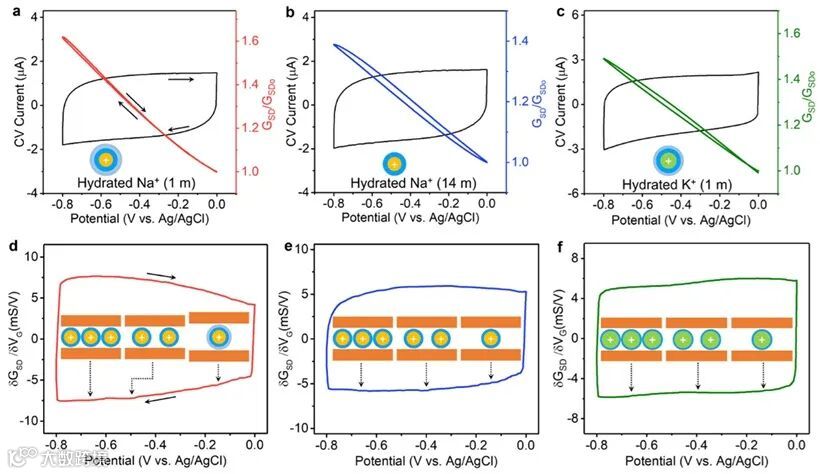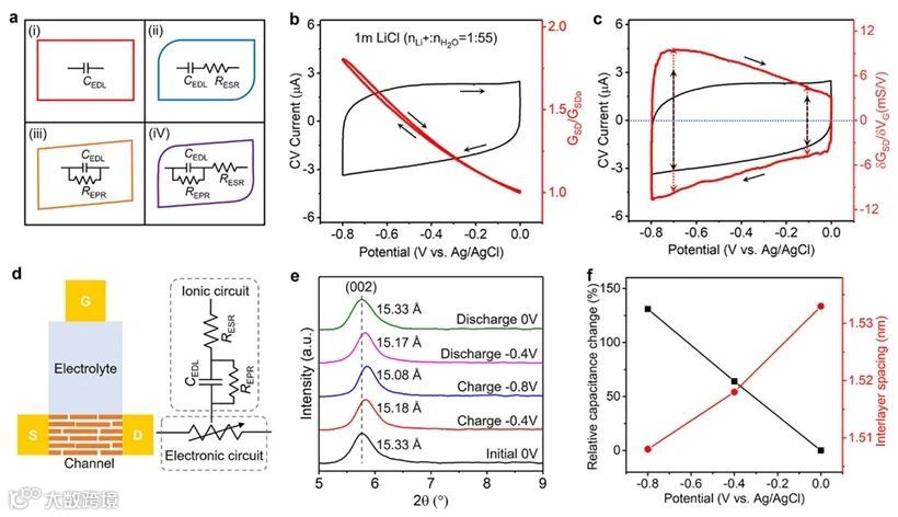 然而,从同时进行的CV和ETS测量中,可以看出CV曲线和𝛿GSD/𝛿V曲线的明显差异。实验观察到微分ETS曲线(𝛿GSD/𝛿V)在 Li+嵌入(负极化)和脱嵌(正极化)过程中几乎完全对称(横轴)。相反,CV 测量在 Li+嵌入和脱嵌过程中表现出不对称的平行四边形行为。ETS测量的是 MXene 电容信号的GSD响应,它不涉及电化学电流测量,并且很大程度上不受寄生电阻分量的影响。因此,ETS 可以更准确地测量器件的真实电容(C)信号。根据𝛿GSD/𝛿V曲线,电容随电位降低而增大,如果假设介电常数在不同电位下保持不变,MXene 纳米片与Li+之间的双电层距离 (d ) 在较低电位下会变小。该实验展示了一种可能的情况是,在电势的作用下,水合Li+逐渐去溶剂化,导致水合壳层变小,从而在较低电位下d也较小,致使𝛿GSD/𝛿V值增大。
