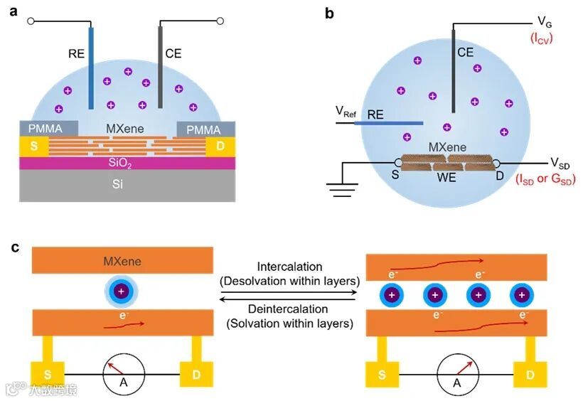 电输运谱ETS采用四电极配置。在这种配置下,通过参比电极精确调节施加在MXene薄膜上的电化学势,以驱动所需的离子嵌入/脱嵌过程,同时监测MXene电化学界面的电导率。由于MXene纳米片中的电子迁移率(2-4 cm2•V–1•s–1)远高于电解液中的离子迁移率(4-8 × 10–4 cm2•V–1•s–1),MXene薄膜电化学响应的任何变化都会引起ETS测量的即时响应。因此,MXene薄膜电导演变的operando测量提供了一种可靠有效的信号通路,可以揭示MXene限域空间内水合阳离子在不同电化学电位下的界面特性。增加栅极电位(VG)会驱动阳离子插入,从而诱导MXene中的电子载流子增多,导致ETS测量中的ISD或GSD增大,遵循以下关系(公式1和2):