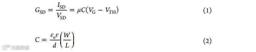 其中μ为电子迁移率,C为栅极电容,VG为栅极电压,VTH为阈值电压,VSD为源漏电压,εo为真空介电常数,ε为相对介电常数,d为MXene纳米片与阳离子之间的距离,W/L为宽长比。