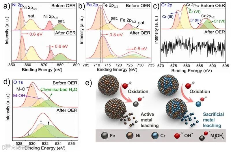 图3. Ni3Fe1.2Cr0.8Ox在 OER 过程中的表面变化与 Cr 浸出机制。