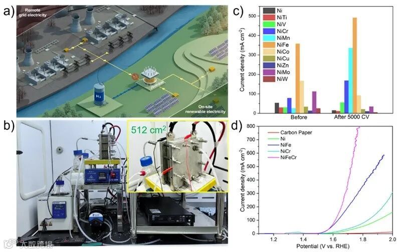 沙特阿卜杜拉国王科技大学(KAUST)卢旭教授团队与上海电气、沙特阿美石油公司联合,在《德国应用化学》(Angew. Chem. Int. Ed.)报道了一项突破性的研究,提出了一种瞬态助剂(transient-promoter)策略,促进镍铁(NiFe)羟基氧化物催化剂的形成与稳定,从而实现千瓦级阴离子交换膜水电解槽(AEMWE)在波动电力输入下的可靠运行。在实验室规模下,体系在 80 °C 下仅需 1.68 V即可实现 1 A cm-2的电流密度,并在恒定和波动负载下连续稳定运行超过 30 天。团队将1 cm2的单池放大到8池串联、总面积为 512 cm2的 2.5 kW 电堆后,实现了在十三个模拟太阳能循环(>50 h)中依然能够稳定产氢的较高稳定性。具体而言,该千瓦级电堆在 60 °C 下实现 1 A cm-2、单池电压 1.78 V的性能,与实验室规模结果高度吻合。除了规模放大,这项研究还系统揭示了瞬态助剂机制。光谱学证据显示,铬(Cr)有多重功能:(1)改变 Ni/Fe 的氧化态,从而促进羟基氧化物的形成;(2)诱导孔隙结构,增强 OH-的传输和电解液渗透;(3)作为一种牺牲性助剂,以可控的方式溶出,从而在循环过程中保护 NiFe 基体。这项工作证明可持续、非贵金属催化剂能够在千瓦级 AEMWE 堆中同时实现高本征活性和长期稳定性,并可直接由间歇性可再生能源驱动。通过结合机理洞察、合理的催化剂设计和在 2.5 kW 工业相关堆中的验证,该研究在基础科学和实际技术上实现了双重突破。