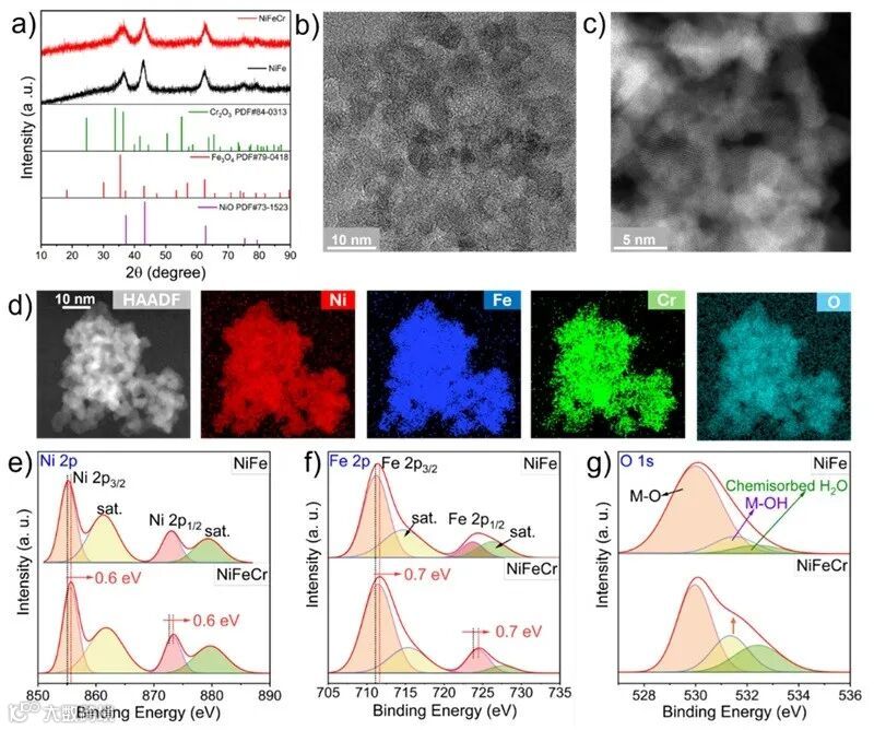 图2. Ni3Fe1.2Cr0.8Ox纳米颗粒的结构与成分表征。