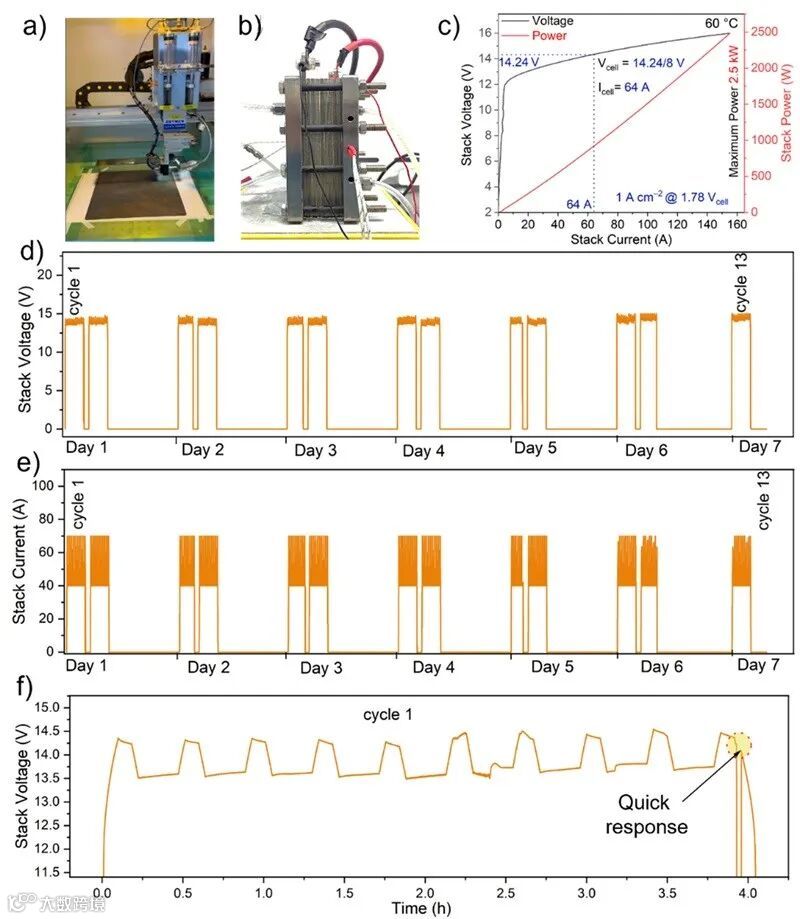 图6. 基于 Ni3Fe1.2Cr0.8Ox 的AEMWE 堆的千瓦级性能与动态运行稳定性。
