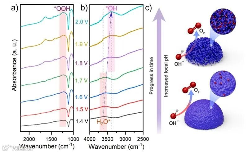 图4. Ni3Fe1.2Cr0.8Ox在 OER 过程中的原位 ATR-SEIRAS 分析。