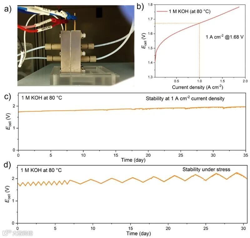 图5. 基于 Ni3Fe1.2Cr0.8Ox的实验室规模 AEMWE 的性能与运行稳定性。