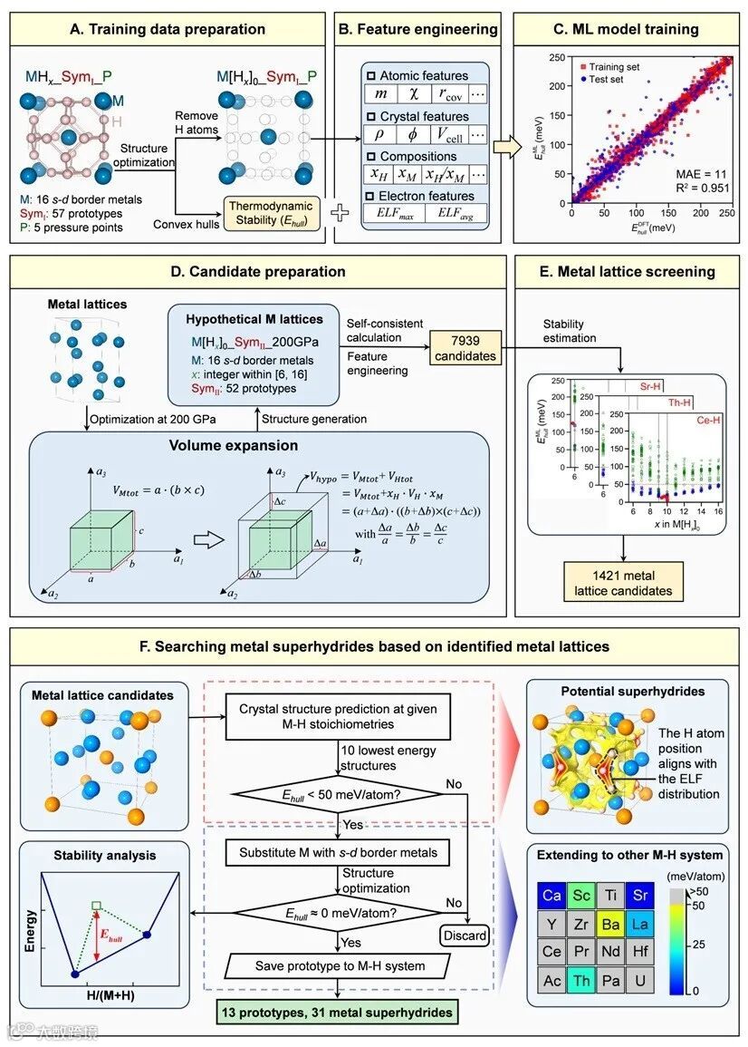 图1. 金属超氢化合物计算设计的工作流程。(A)通过从文献中收集到57种金属超氢化合物结构原型,并利用16种s-d区金属元素进行替换,之后在100-300 GPa(间隔50 GPa)下进行结构优化,最终得到4151个结构信息以及对应的热力学稳定性(凸包能)。(B)将优化好的MHx结构中的氢原子全部去除,提取剩余金属晶格的元素特征、晶体特征、配比信息和金属间隙电子分布强度(反映化学模板效应强度)并进行特征筛选。(C)基于筛选后的特征与图1A中的凸包能训练“金属晶格→稳定性”的预测模型。(D)构建52种与训练集完全不同的新金属晶格,根据不同的金属元素和不同的加氢比例扩展金属晶格的体积,并开展特征工程,最终得到7939种候选金属晶格。(E)利用图1C中训练好的模型对候选金属晶格进行筛选,最终筛选出1421种具有高“承氢”潜力的金属骨架(模型预测凸包能<50 meV/atom)。(F)以这些金属骨架为起点,对应添加一定数量的氢原子开展晶体结构搜索,并对计算验证凸包能<50 meV/atom的结构原型开展元素替换,并最终获取热力学稳定(凸包能=0)的新型金属超氢化合物材料。