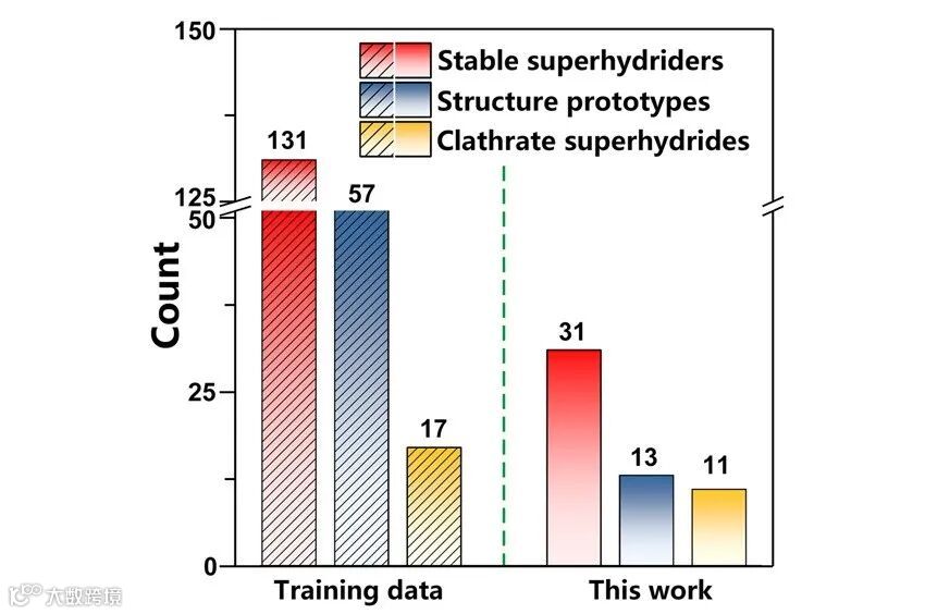 图4. 新发现结构与已知一百余种结构的总数量、结构原型数量和网络状氢晶格结构数量的对比图,在结构总量与类型上均实现超过23%的增长,在网络状氢晶格结构上实现了65%的增长。