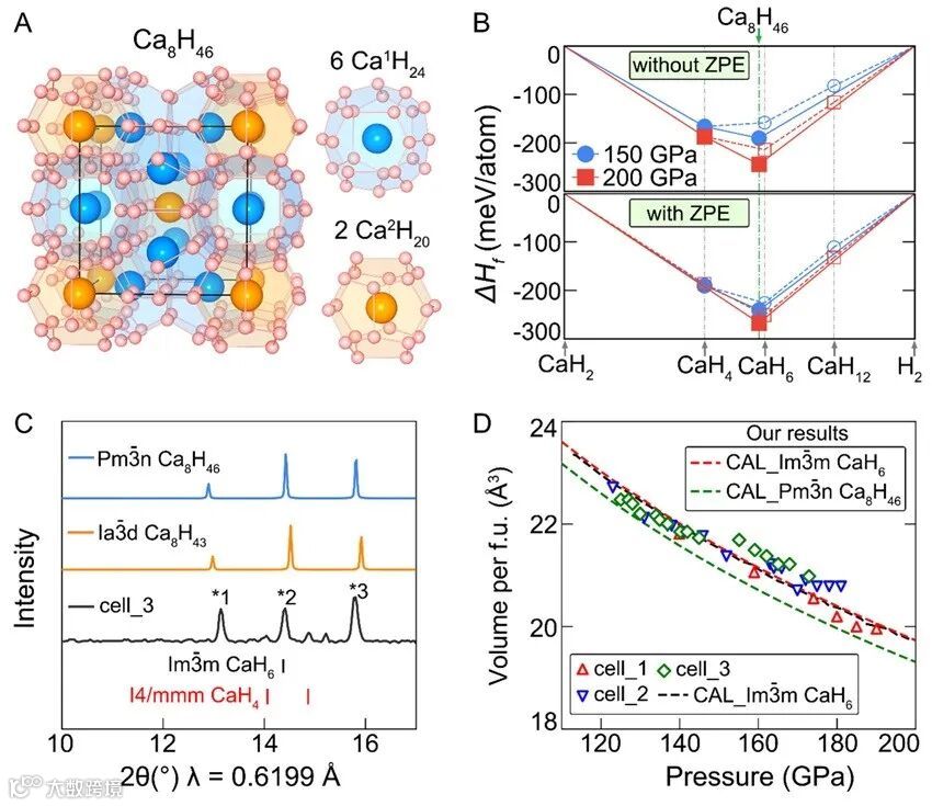 Ca8H46结构为例,该结构在由所有已报道的Ca-H结构所构建的凸包图上依然保持稳定。(C-D)从已发表文献 (PRL, 2022, 128, 167001)中发现