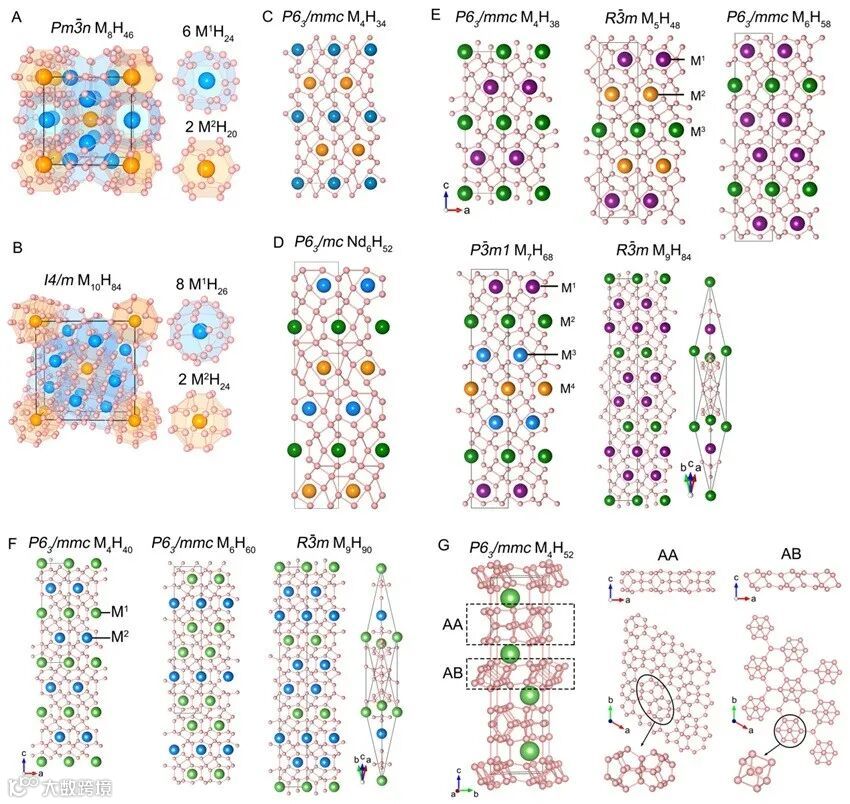 M8H46 (M= Ca, Sr, Y)结构,(B)I4/m M10H84结构(M = Pa, Nd, U),(C)P63/mmc M4H34 (M = Pa, Pr)结构,(D) P63/mc M6H52 (M = Nd),(E)5种MH9+δ结构 (0<δ<1, M= Ce, Th),(F)3种M9H90结构(M = La, Ce, Th),(G)P63/mmc M4H52 (M = La, Sr, Ac)。
