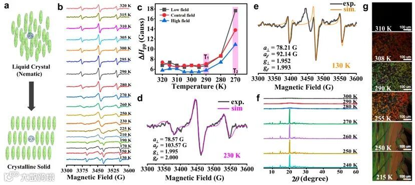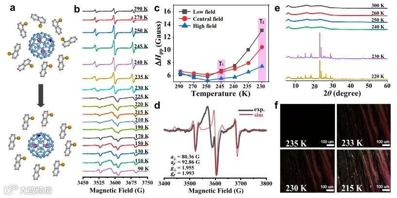 如图2所示,在1-氯萘体系中,Y2@C79N的变温EPR信号在245 K和230 K展现出两个清晰的转变点,分别对应1-氯萘的熔融起始点和结晶起始点。在230 K以下,结晶诱导了Y2@C79N的取向,EPR信号转变为轴对称特征。变温XRD和偏光显微镜(POM)表征结果均证实了EPR检测到的结晶转变点与常规方法高度吻合。