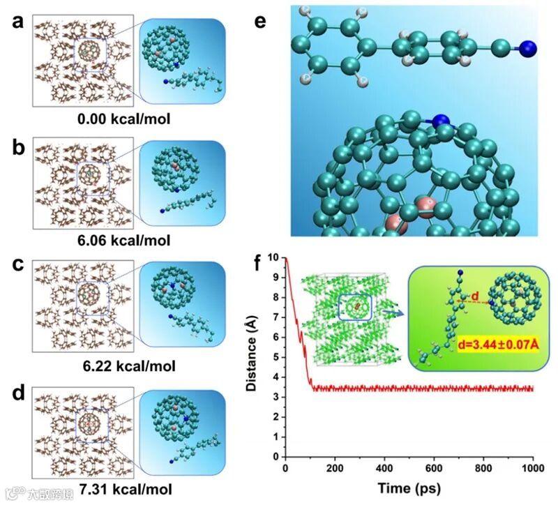 为了深入理解Y2@C79N分子自旋传感机制,与贵州医科大学赵冲副教授合作开展了密度泛函理论(DFT)计算和分子动力学(MD)模拟。如图4所示,计算结果表明,在5CB晶体中,Y2@C79N最稳定的构型是碳笼上的氮原子靠近5CB分子中连接氰基的苯环。MD模拟进一步动态展示了Y2@C79N分子在5CB晶体中的取向过程。