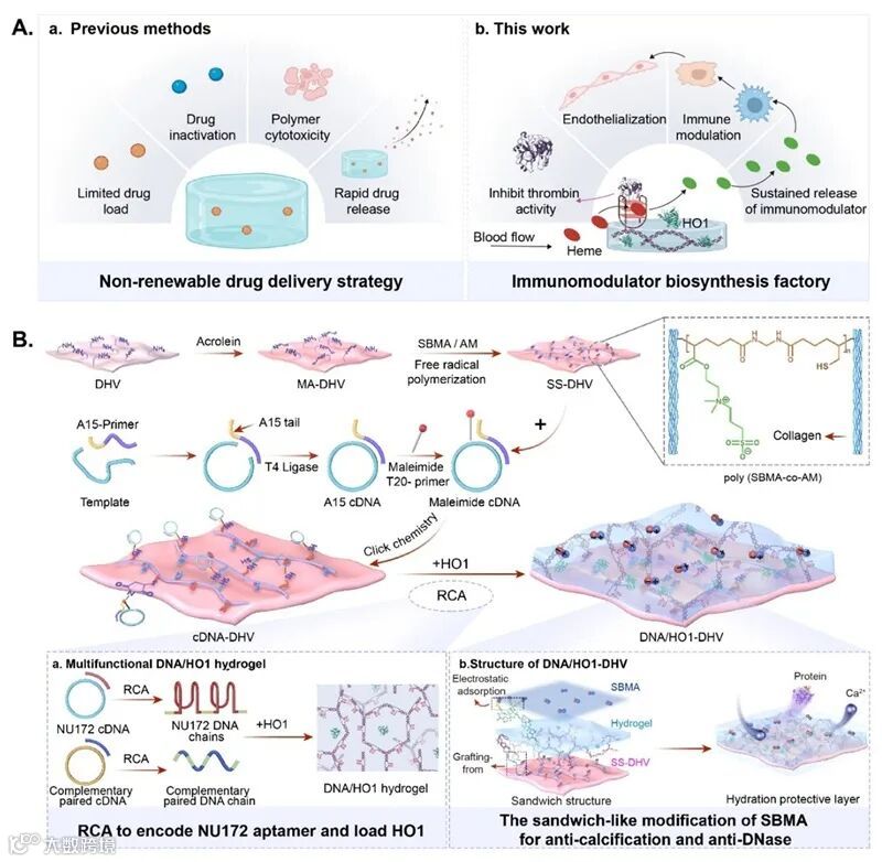 在本研究中,吴钰周教授和董念国教授团队提出了一种创新且高效的策略,通过利用滚环扩增和酶催化技术,开发了一种基于DNA的免疫调节剂生物合成工厂修饰瓣膜。该材料利用编码NU172适配体的DNA水凝胶,在实现抗凝功能的同时能够自主捕获血液循环中的血红素,持续驱动血红素加氧酶1(HO1)原位合成并释放胆绿素(BV)。这种设计不仅高效抗凝,还能长效调控瓣膜免疫微环境,从而促进组织修复和再生。