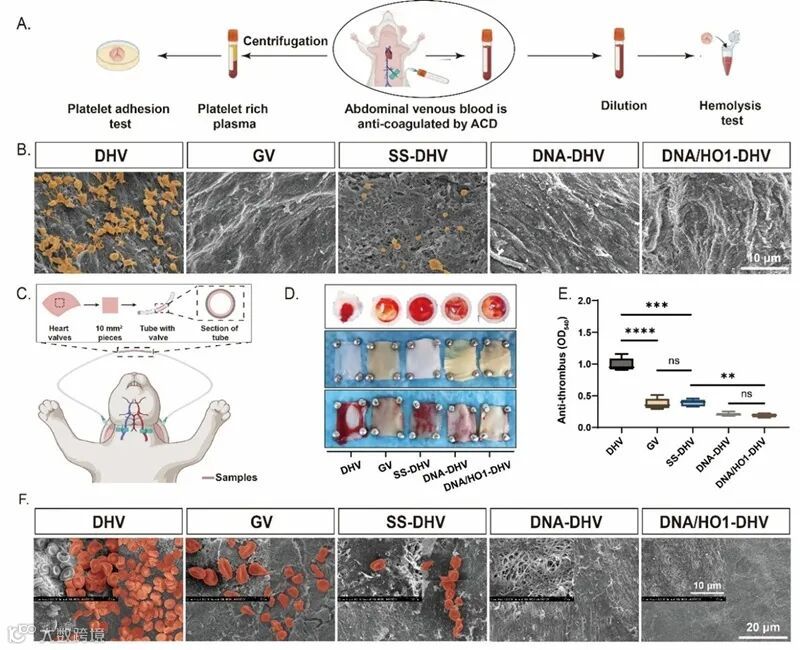 随后,作者利用体外血液相容性测试和体内兔颈动脉模型对DNA/HO1-DHV的抗凝性能进行了深入的分析,发现DNA/HO1-DHV由于表面具有大量的NU172适配体片段,能够有效抑制血小板的黏附与激活,抑制材料表面血栓的形成。