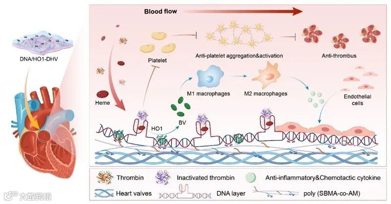 图2. DNA/HO1-DHV抗凝及指导瓣膜再生示意图