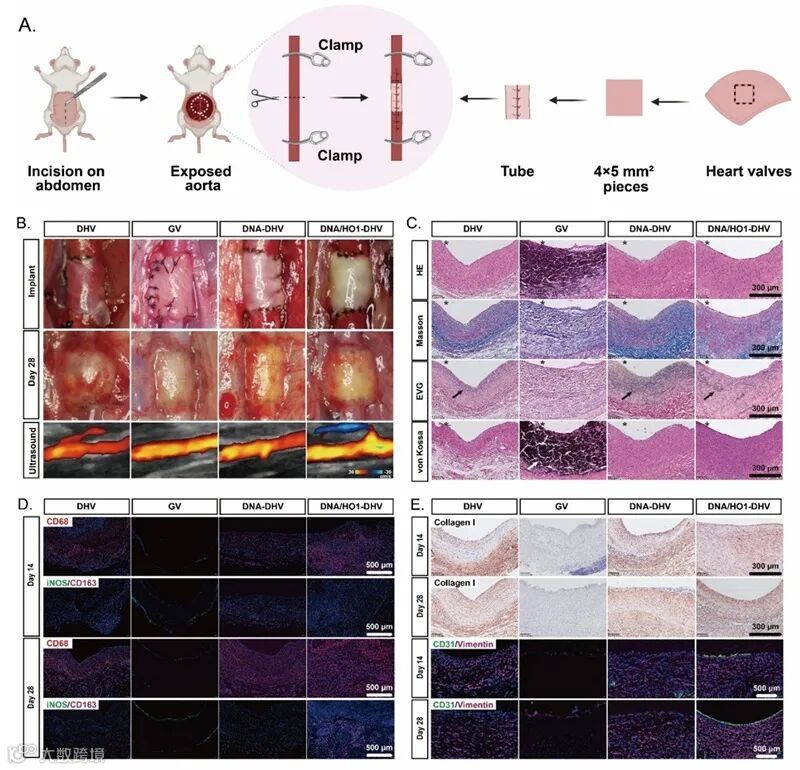 最终,为了更好模拟心脏瓣膜的体内环境,作者采用腹主动脉移植模型评价该材料的免疫调控和再生能力。当将该材料植入体内,DNA/HO1-DHV自主俘获血液循环中的血红素,并被HO1催化合成BV,诱导巨噬细胞向M2表型极化,促进细胞迁移和组织再生。从实验结果能够看到,植入体内28天后,DNA/HO1-DHV有效抑制了瓣膜钙化、实现了完整内皮细胞层的重塑并明显促进了一型胶原的重塑。