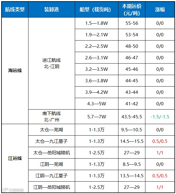 随着六大电厂的库存逐渐增加,下游电厂补库需求不高加之期货价格下跌,货主处于观望心态,而船东由于油价上涨、台风登陆的影响,让价意愿不高,双方僵持不下,今日海运价格整体维稳;受到上游落水船运成本增加的影响,周三江运价格小幅上涨。