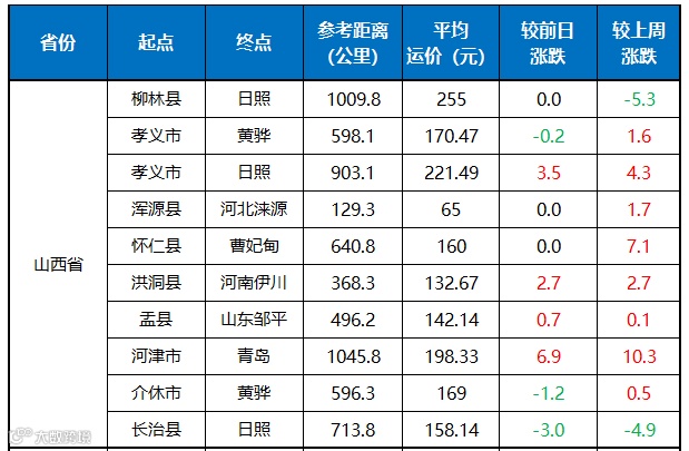 【山西省】周二山西地区运价波动幅度在1-7元/吨之间,近日吕梁地区受到安全检查影响,产量有所下降,焦炭价格高企,下游采购积极性减弱,部分线路运价小幅下跌。