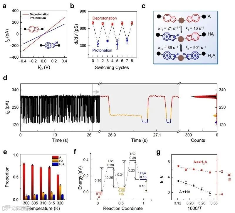 基于稳定器件平台,实时观测了薁分子的质子化/去质子化动态变化(图5)。在三氟乙酸刺激下,分子呈现三种电导态:去质子化(A)、单质子化(HA)和双质子化(H2A)(图5c)。实时电学谱显示三者间跃迁过程(图5d),活化能为0.32 eV(与理论计算吻合)。通过Arrhenius方程和van't Hoff方程,推导出质子化/去质子化动态变化过程焓变为ΔH = –0.18 eV(图5g)。