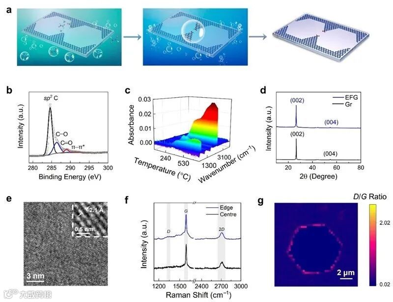 通过溶剂调控Friedel-Crafts酰化反应,在石墨烯边缘原位修饰羧基基团(图3a)。X射线光电子能谱(XPS)显示C=O特征峰(~288.9 eV),O1s/C1s原子比从0.21增至0.43(图3b);热重-红外联用(TGA-FTIR)证实C=O伸缩振动峰(1684 cm–1)出现(图3c)。拉曼光谱显示D/G峰比仅在石墨烯边缘增强(D/G=0.63),而石墨烯基面保持完整(图3f-g),证明功能化修饰具有边缘选择性。