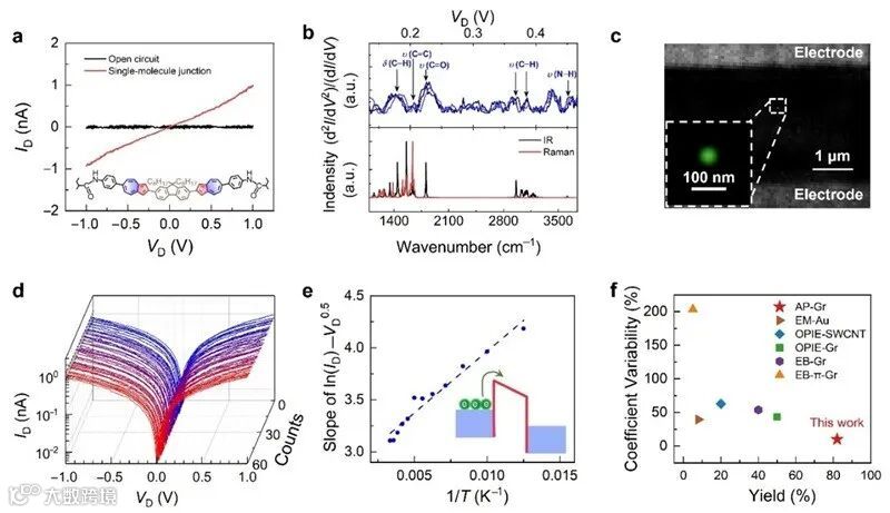 将氨基封端的薁分子通过酰胺键共价连接至石墨烯间隙(图4)。电学表征显示器件电导从开路状态的~0 nA升至~1 nA(图4a)。非弹性电子隧穿谱(IETS)在226 mV(v(C=O))和452 mV(v(N-H))处观测到酰胺键特征峰(图4b),证实分子稳定桥接。60个器件的室温I–V曲线表现出高度的器件均一性,平均电导为(1.16±0.12)×10–5 G₀(G₀=77.5 µS),变异系数为10.73%(图4d)。