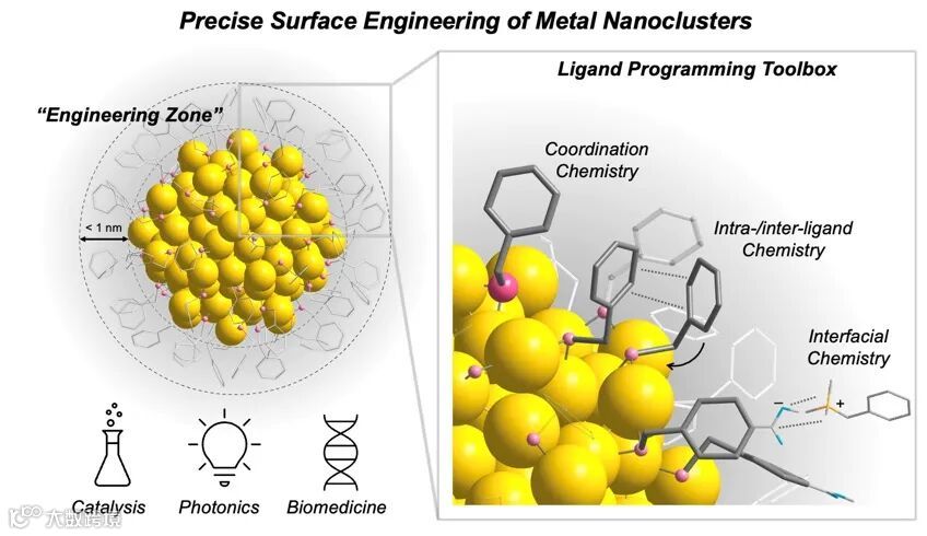图1. 金属纳米团簇表面“工程区”的示意图,以及通过配体编程实现功能化设计的化学策略。