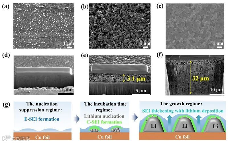随后研究了Li沉积过程中SEI的形成机制,结果表明锂沉积过程分为三个关键阶段,SEI呈现阶段性演化(图5):(1)成核抑制期(0-1 min):无明显锂沉积,SEI为电化学驱动SEI,厚约160 nm,以LiF(58%)、Li2CO3(35%)为主;(2)孕育期(2-5 min):锂枝晶开始形成(图5b, e),SEI从电化学驱动SEI向复合结构转变,出现金属Li0信号;(3)生长期(5-60 min):锂沉积厚度达32 μm,SEI与锂基质同步生长,全深度均检测到SEI组分与 Li0共存,证实SEI的动态重构。