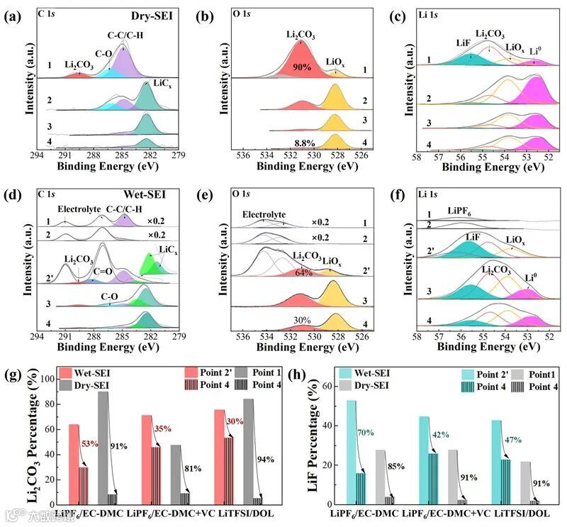 作者对同一条件下形成的SEI进行对比分析。Dry-SEI表征(传统XPS表征):样品经 DMC溶剂 清洗并干燥后进行 XPS 测试。结果显示,有机物(如聚合物碳氢化合物)以及无机物种(如 LiF、Li2CO3、LiCx和 LiPxOyFz)发生显著流失(图2b 和图3a-c)。因此,该方法无法反映真实的 SEI 化学组成。Wet-SEI表征(冷冻 XPS 表征):(1) 保留了原始电解液(LiPF6/EC-DMC)组分。(2) 揭示了SEI的完整组分:包括聚合物碳氢化合物(C-C/C-H)、羰基(C=O)、醚键/酯键(C-O)等有机物和LiCx(在 282.5 eV 和 283.5 eV 处呈现双峰)、LiF、LiOx、Li2CO3等无机物(图2c 和图3d-f)。(3) 解析了更准确的梯度趋势: Wet-SEI中碳氢化合物、Li2CO3和LiF呈现梯度递减趋势,而Dry-SEI中这些组分则迅速减少。这些差异现象在多种电解液体系中普遍存在,其根本原因在于传统XPS分析过程中溶剂清洗步骤导致部分SEI组分的溶解,以及随后干燥过程中SEI结构的塌陷。这表明冷冻 XPS 表征得到的 SEI 组成信息更接近其原始状态。