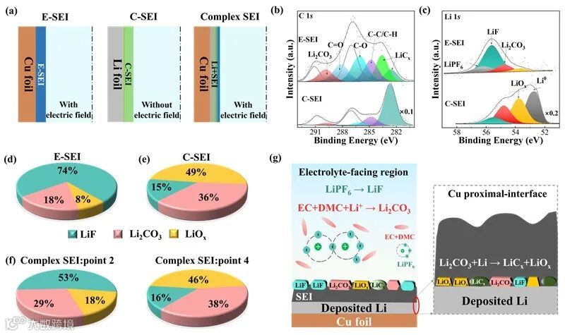 进一步通过解耦SEI形成的过程,可以将SEI区分为电化学驱动形成的SEI(E-SEI)和化学驱动形成的SEI(C-SEI)(图4)。基于E-SEI和C-SEI两种结构的分析结果,对实际Li沉积过程中(即同时存在化学驱动和电化学驱动过程)SEI的化学组成开展深度剖析冷冻XPS表征,发现靠近电解液区域SEI以 LiF(~53%)、Li2CO3(~28%)为主,对应电解液电化学还原产物(E-SEI);靠近Cu电极区域SEI中LiOx占比升至~46%,LiCx(282.5 eV)成为主要碳物种,对应化学驱动形成的SEI为主(C-SEI)。