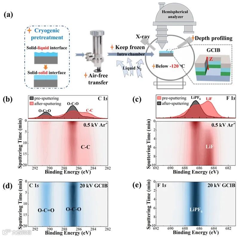 中国科学院大连化学物理研究所傅强团队提出冷冻XPS(cryo-XPS)结合Ar气体团簇离子束(GCIB)深度剖析的表征新方法,并应用于锂金属电池(LMBs)中原生SEI层结构的高保真、高灵敏表界面分析。具体而言,cryo-XPS通过快速冷冻将液态电解质-SEI-电极界面转化为“固-固”状态,彻底规避了传统表面分析过程中样品制备带来的结构破坏与成分流失,完整保留了原生SEI的所有界面组分和结构。GCIB深度剖析技术相比传统氩离子(Ar+)溅射,大幅降低了化学损伤,能够精准映射SEI整体的化学梯度。两者结合后,可重构原生SEI的完整成分分布,为动态液固界面的分析和表征提供了具有深度分辨的表界面研究新方法,解决了传统表面分析技术难以准确分析液固界面处原生SEI的挑战。