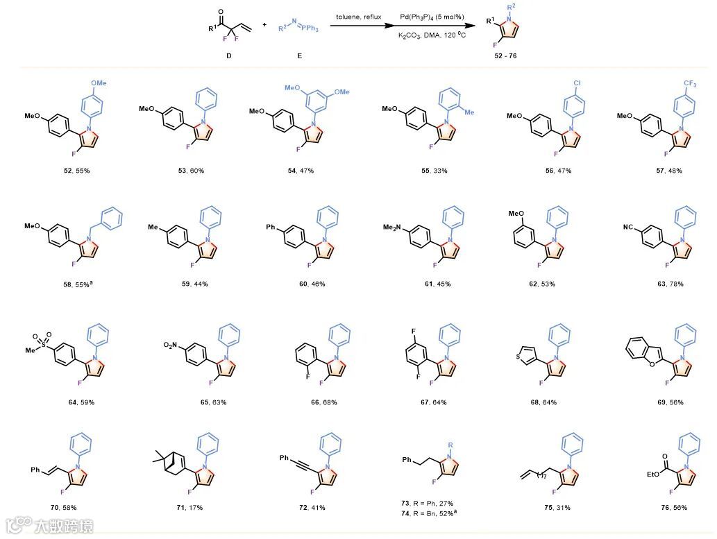 确定了反应条件之后,作者对这一钯催化的反应底物适用范围进行了探索(图4)。对氮上取代基的考察显示带有给电子和吸电子取代基的苯环均能很好兼容,邻位取代基由于位阻效应产率有所降低(52-57)。在偕二氟烯丙基取代酮的适用范围方面,除了各种取代类型的芳环及杂芳环外(59-69),钯催化的方法还适用于烯基,炔基,烷基和酯基取代的酮(70-76)。值得注意的是,使用苄胺与酮直接缩合成亚胺,再在钯催化下环化的方法,两个氮上连有苄基的三取代吡咯也能顺利得到(58、74)。