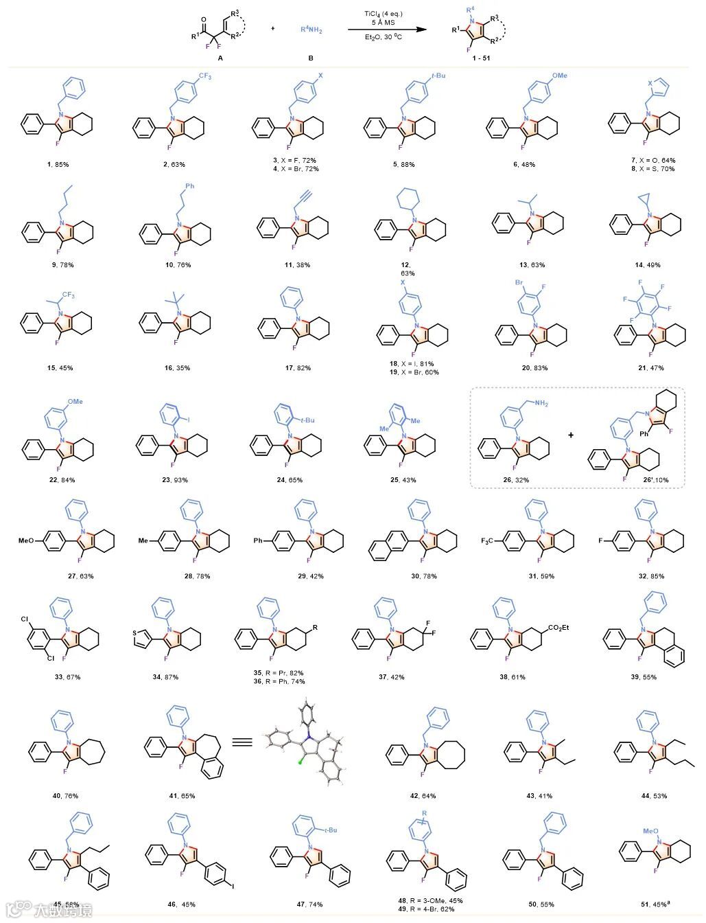确定了最优反应条件之后,作者对偕二氟烯丙基取代酮和胺的适用范围进行了考察(图2)。各种苄胺、烷基胺均能以中等到高收率得到产物(2-6),杂芳环取代及普通一级胺也都能顺利发生反应(7-11)。此外,二级取代烷基胺(12-15)和叔丁胺(16)的反应也都能顺利实现。除脂肪胺外,各种芳胺也都能顺利得到对应产物(17-25)。对于邻位带有取代基的芳胺(23、24),产物以一对轴手性异构体的形式存在,为未来的动力学拆分提供了可能。当底物中同时带有芳胺和脂肪胺片段时,实验结果表明芳胺的反应活性比脂肪胺更高(26 & 26’)。对偕二氟烯丙基取代酮的底物拓展显示,反应可以兼容苯环上相连的各种取代基(27-34),但将芳环换做烷基取代基会带来产率的大幅下降,推测原因可能是反应经历的亚胺中间体在这种情况下会发生亚胺-烯胺互变从而干扰反应。之后,作者对不同烯烃取代类型的底物进行了考察,发现酯基和二氟亚甲基都能很好兼容此反应(37、38)。反应也适用于六至八元的环状烯烃底物且苯环的稠并对反应也没有影响(39-42)。其中,化合物41的结构经X射线单晶衍射加以确认。对于开链烯烃底物,反应可以适用于各种1,2-二取代烯烃及2-取代烯烃,且C2上取代基可以兼容烷基或芳基(43-50)。最后,从对应肟醚出发,在AlMe3作为Lewis酸的条件下也能以中等收率得到产物(51)。遗憾的是,Lewis酸活化的反应模式并不适用于单取代烯烃底物(R2=R3=H)。