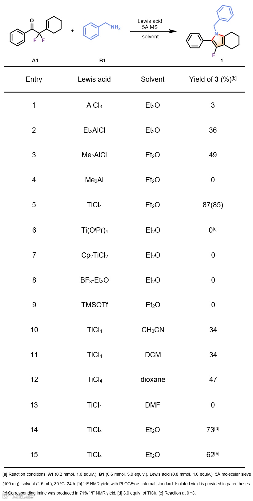 作者首先选取了偕二氟烯丙基取代酮A1和苄胺B1作为模板底物进行反应探索(表1)。首先一系列含铝的Lewis酸筛选发现Me2AlCl能够以中等收率得到产物(entry 3),进一步对其他Lewis酸筛选发现TiCl4能够以高收率得到产物,而其他含钛的Lewis酸或其他常用Lewis酸如BF3-Et2O和TMSOTf等均不能得到产物。对溶剂的筛选显示乙醚是最优溶剂。最终,反应的最优条件确定如下:3当量的胺,4当量的TiCl4,5Å分子筛作为添加剂。