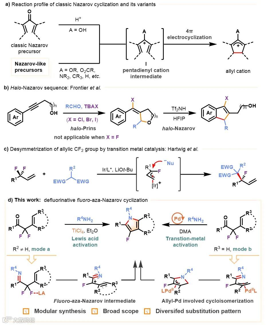 实现多氟基团的选择性单个碳氟键官能化在合成上具有重要意义,可以在避免氟化试剂的使用的同时从容易获取的原料快速完成多样化含氟结构的构筑。然而,由于多氟基团中碳氟键的键能会随着氟原子数目的减少而降低,控制反应停留在选择性单个碳氟键官能化仍然是现代有机化学中尚未得到很好解决的一个挑战,现有报道的方法一般也局限于特定类型的底物。例如,借助铱催化,Hartwig课题组报道了烯丙位偕二氟基团的单个碳氟键活化,实现了含氟季碳中心的对映选择性构筑(图1c)。此外,强Lewis酸介导的氟离子攫取也是碳氟键活化的一种常用策略。南京工业大学冯超教授课题组长期致力于有机氟化学领域的研究,取得了一系列显著成果(J. Am. Chem. Soc. 2017, 139, 1762;J. Am. Chem. Soc. 2016, 138, 15869;Angew. Chem. Int. Ed. 2021, 60, 20237;Angew. Chem. Int. Ed. 2019, 58, 3918;Chem. Sci. 2022, 13, 2686;Chem. Sci. 2019, 10, 8701;Chem. Sci. 2019, 10, 6721;Chem. Sci. 2019, 10, 1144)。最近,该课题组开发了一种基于偕二氟基团单个碳氟键断裂引发的氮杂Nazarov环化,成功实现了首例氟代Nazarov环化反应。该反应可以在Lewis促进或钯催化的条件下发生,高效实现多种取代类型,包括全取代β-氟代吡咯结构的构筑(图1d)。