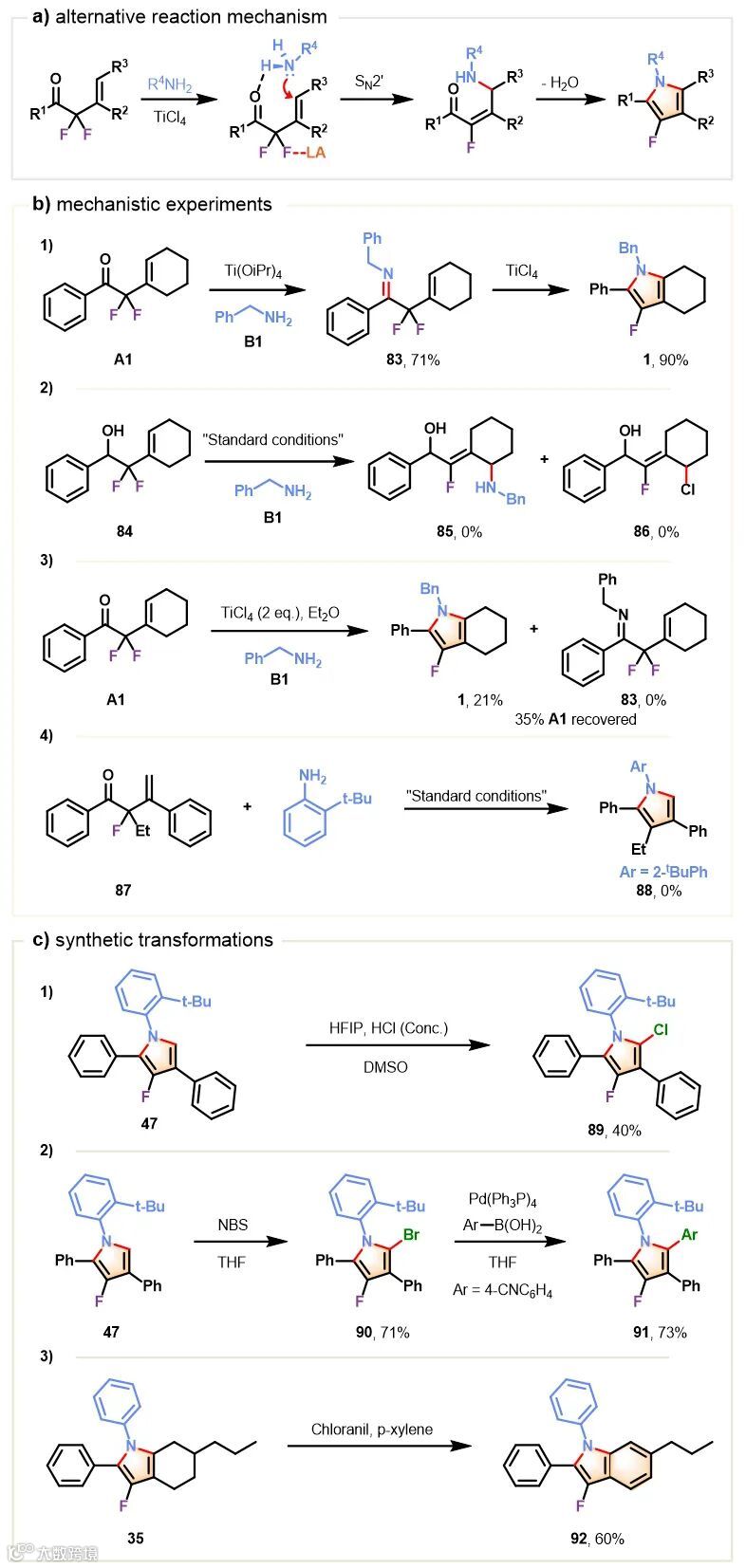 除了作者设计的反应路径之外,该反应还可能以另外一种路径进行,即胺首先与烯丙基偕二氟发生SN2’取代得到氟代烯丙胺,再经过分子内缩合异构化得到产物(图6a)。为了确认反应以哪种模式发生,作者进行了一系列机理实验:首先以四异丙氧基钛作为Lewis酸时,反应会停留在亚胺一步。作者将亚胺分离出来,在四氯化钛的反应条件下可以以高产率得到氟代吡咯产物,证明了反应经过了亚胺的中间体(图6b,式1)。为了验证图6a中的路径是否可行,作者合成了结构上与A1非常接近的二氟取代高烯丙基醇84,在标准反应条件下并没有得到胺或者氯离子发生SN2’取代的产物,从而排除了图6a中的机理(图6b,式2)。在四氯化钛不过量的条件下,反应只得到了氟代吡咯产物和未反应的原料偕二氟烯丙基取代酮,没有观测到亚胺中间体。这一结果表明胺与酮缩合生成亚胺是反应中的决速步,而脱氟的氟代氮杂Nazarov环化是一个快速的过程(图6b,式3)。为了验证剩下的氟原子在氮杂Nazarov环化中是否起到了作用,作者合成了一个单氟取代的底物,结果在标准反应条件下并没有得到产物,证明了氟原子在这步氮杂Nazarov环化中的关键作用(图6b,式4)。作者推测氟原子起的作用可能有两个,一方面是通过氟的α-正离子稳定效应稳定了中间体碳正离子,同时也抑制了碳正离子的其他如消除等的可能副反应。最后,作者对反应产物的应用也进行了初步探索,四取代氟代吡咯47在不同条件下可分别引入氯和溴得到全取代吡咯89和90,后者还可进一步通过Suzuki偶联引入第四个芳环得到四芳基取代吡咯91。在氧化剂存在下,产物35可发生脱氢芳构化得到3-氟代吲哚产物92。