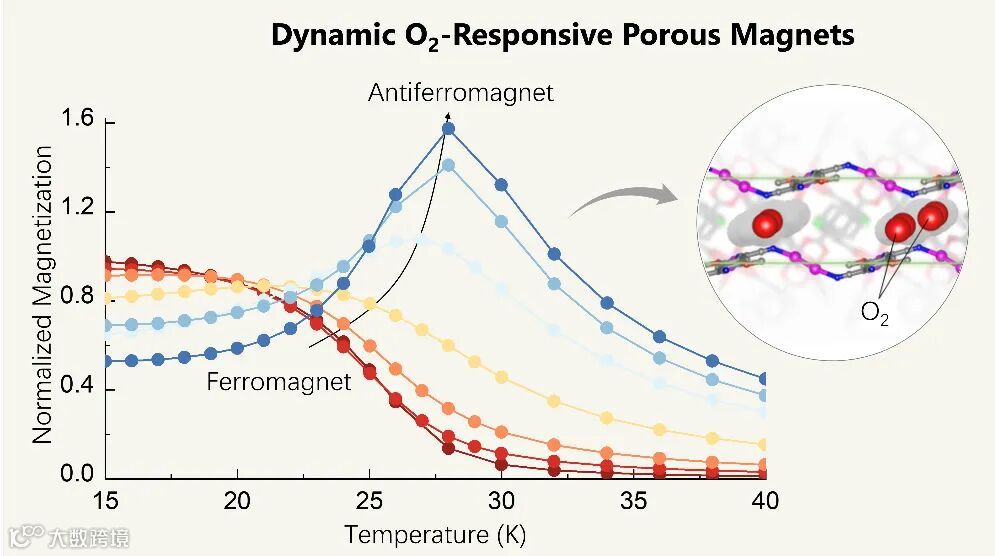 多孔磁体是一类兼具多孔性和磁性的分子基材料,因其可实现可控磁性切换与信息存储、低能耗自旋电子学器件、磁传感与环境监测等潜在应用而备受关注。其独特的开放孔道结构使其能够通过吸附客体分子调控电子与自旋构型,从而实现磁性的切换与调控。气体分子具有快速吸脱附和低损伤性,被视为理想的客体分子。然而,气体与框架的作用较弱,磁性调控效果有限。因此,如何突破气体与框架作用弱、缺乏有效自旋耦合通道的局限,建立气体分子自旋直接驱动的动态磁相演变机制,成为该领域亟待解决的核心科学难题。