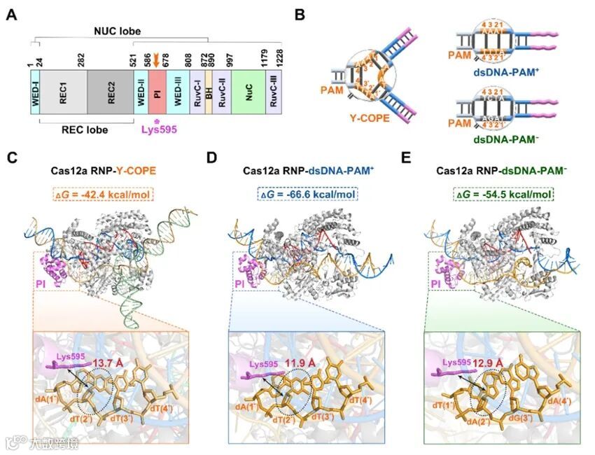 通过结构建模和理论结合能分析计算发现,Y-COPE与Cas12a RNP的结合自由能比经典dsDNA激活子高24.2 kcal/mol,且PAM与Cas12a蛋白PI结构域中关键残基Lys595之间的中心距离增加了1.8 Å,从机制上揭示了PAM拓扑结构抑制Cas12a活性的作用机制。