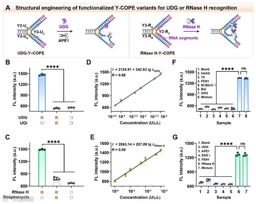 最后,作为概念验证,该团队成功构建了用于尿嘧啶DNA糖基化酶(UDG)和核糖核酸酶H(RNase H)检测的功能化Y-COPE变体。UDG检测限达2.69×10–5 U/μL,RNase H检测限低至2.55×10–7U/μL,且在复杂生物基质中检测性能优良,显示出高的特异性和抗干扰能力。