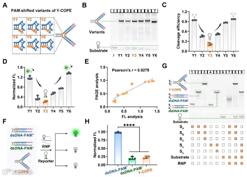 首先,通过合理设计一系列Y-COPE变体(Y1–Y6),逐步将PAM(5′-TTTA-3′)从分支远端移至茎部近端,研究发现Y3变体对Cas12a的抑制效果最强。凝胶电泳(PAGE)和荧光分析结果高度相关(Pearson’s r = 0.9279),证实PAM拓扑结构对Cas12a活性具有可靠有效的调控作用。