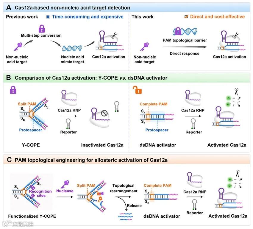 具体而言,该研究团队通过将PAM序列分裂并嵌入三叉连接中心,设计了一种含有Cas12a激活子序列的Y形DNA结构(Y-COPE)。这种精心设计的拓扑结构有效阻断Cas12a对PAM的识别,从而抑制其活性。当目标核酸酶识别切割特定位点后,释放DNA片段并动态修复PAM的双链结构,从而激活Cas12a并触发信号输出。