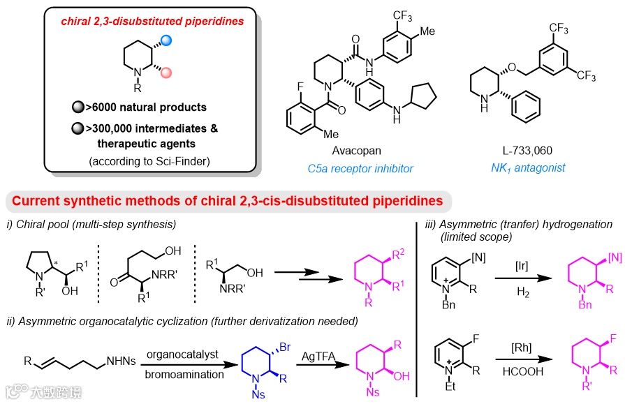 手性顺式2, 3-二取代哌啶是一类重要的含氮杂环化合物。Sci-Finder搜索显示至今超过 6000 种已知天然产物及超过 300,000 种药物活性分子/中间体具有该手性单元 (图1)。如何高效构筑手性顺式2, 3-二取代哌啶结构,高非对称选择性和对映选择性地构筑两个连续手性中心仍然是挑战性课题。发展一个高立体选择性又实用的手性顺式2,3-二取代哌啶化合物的合成方法将同时有助于药物工艺开发和活性小分子的创制。